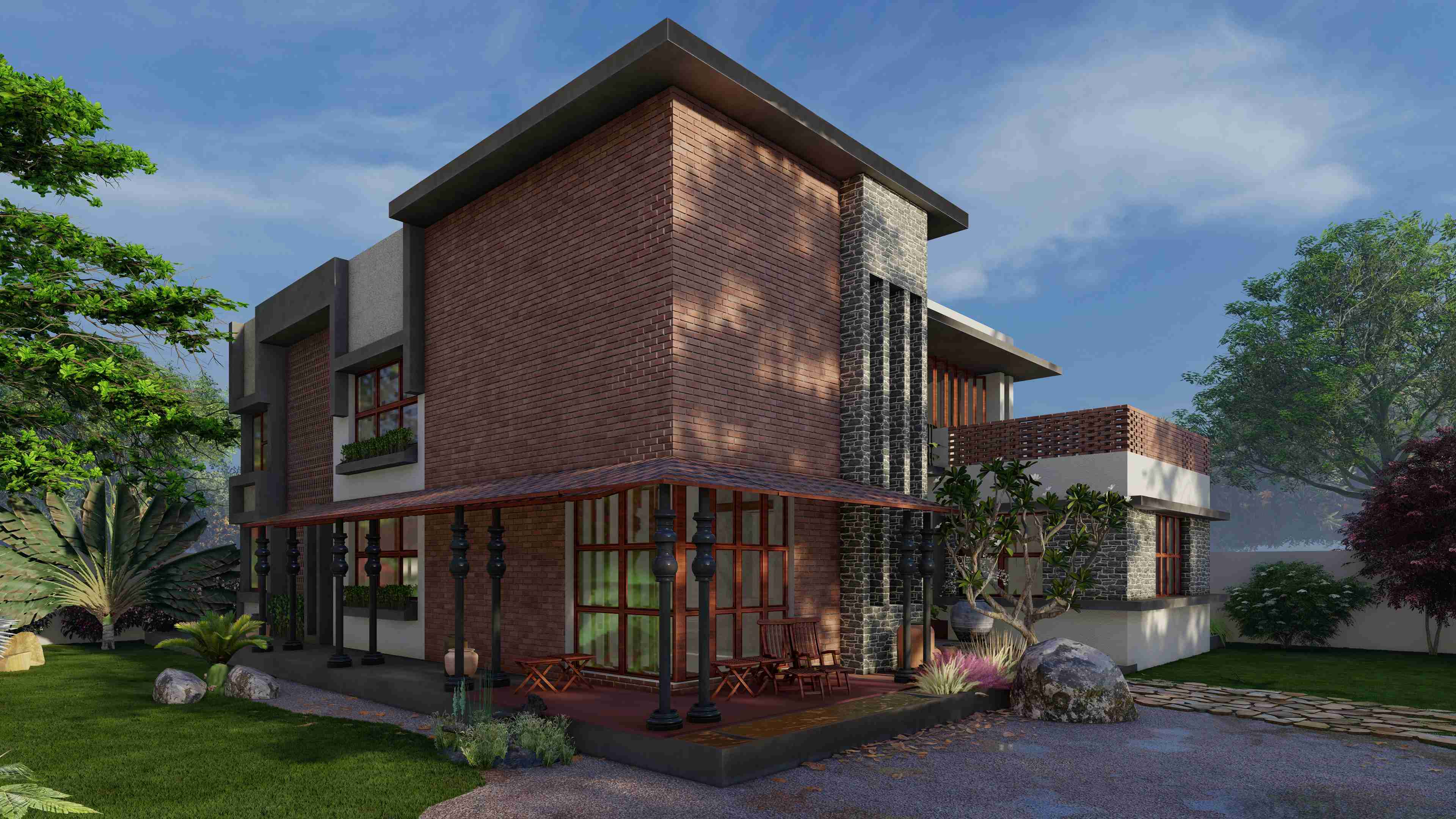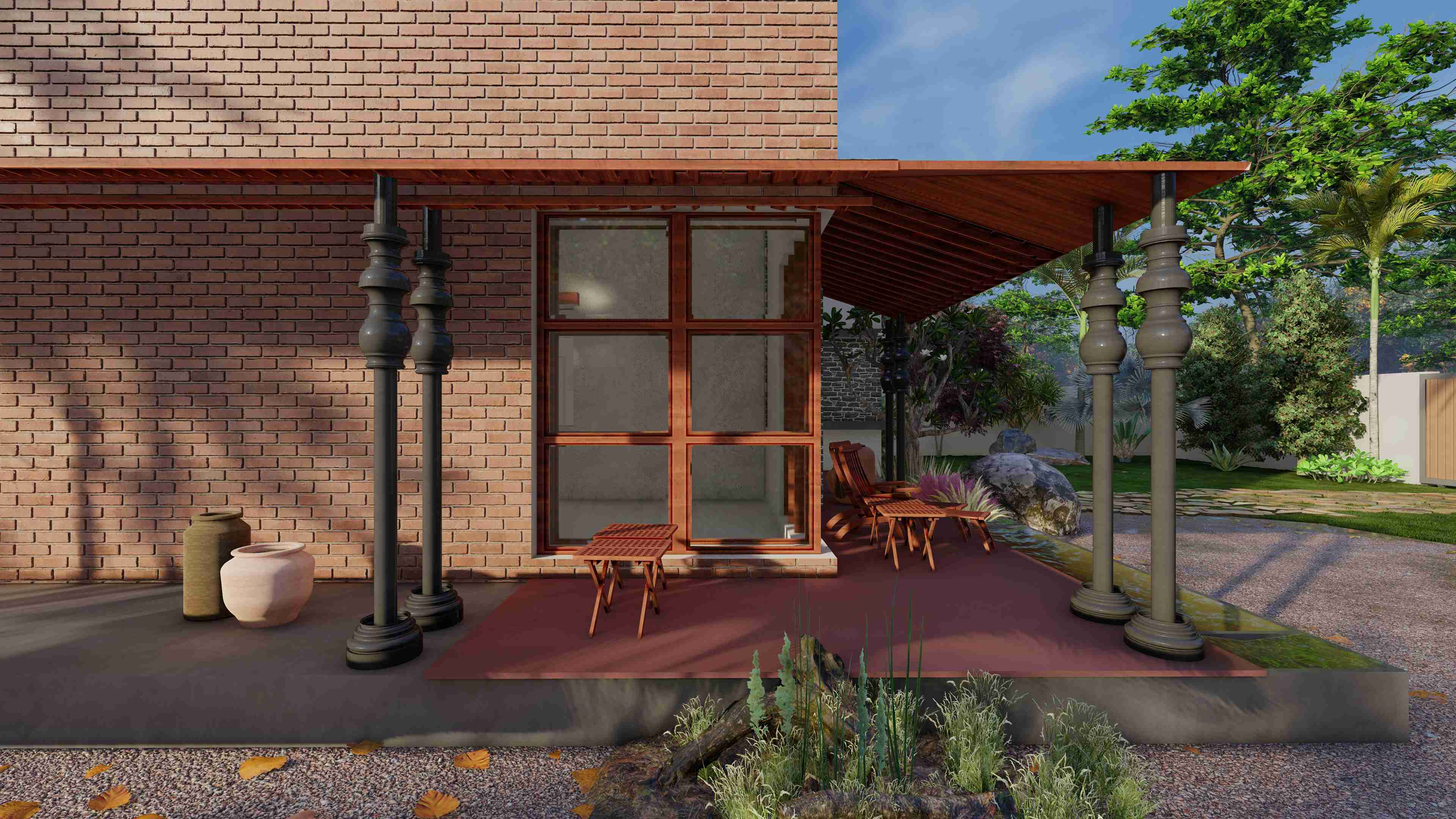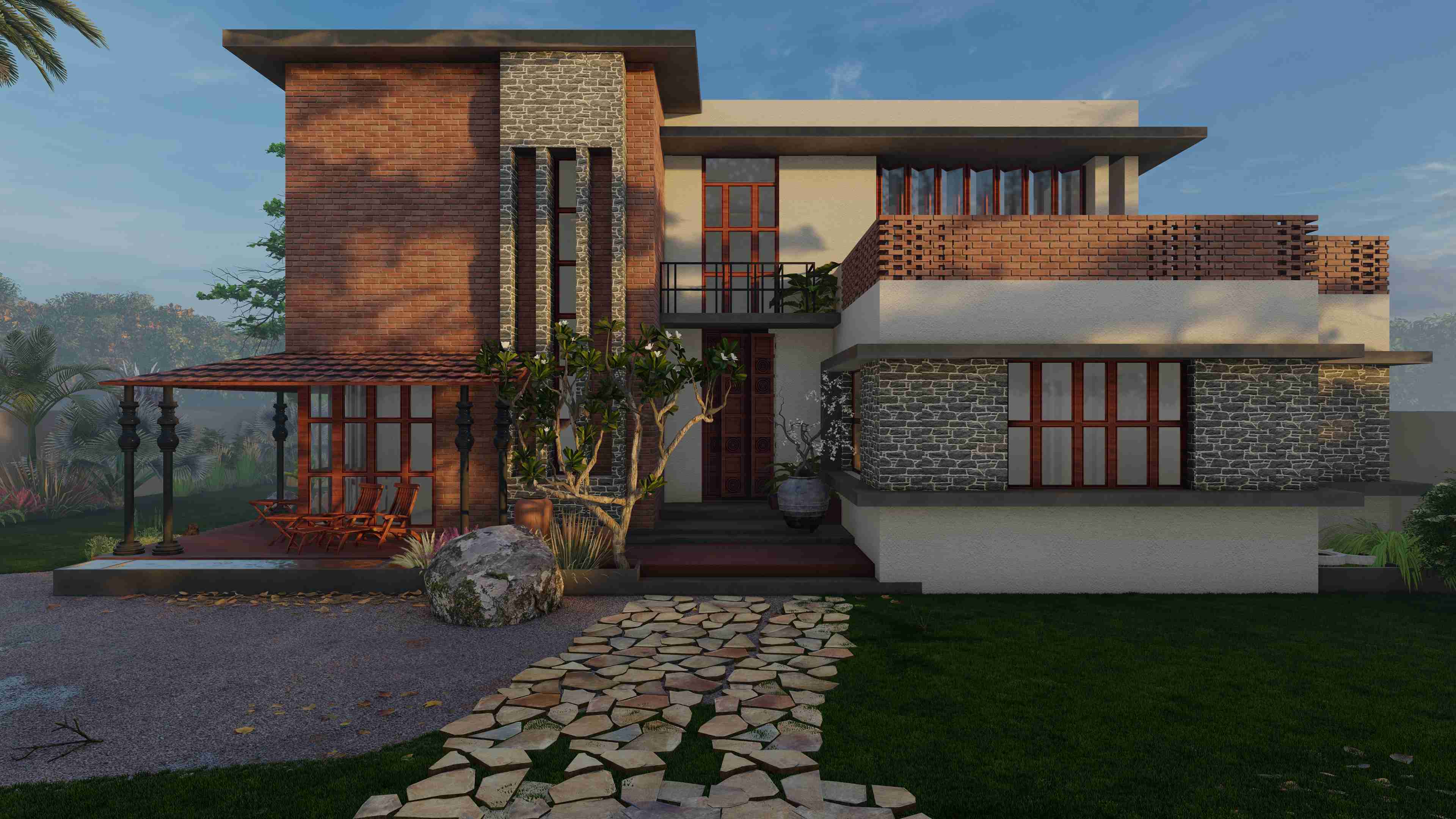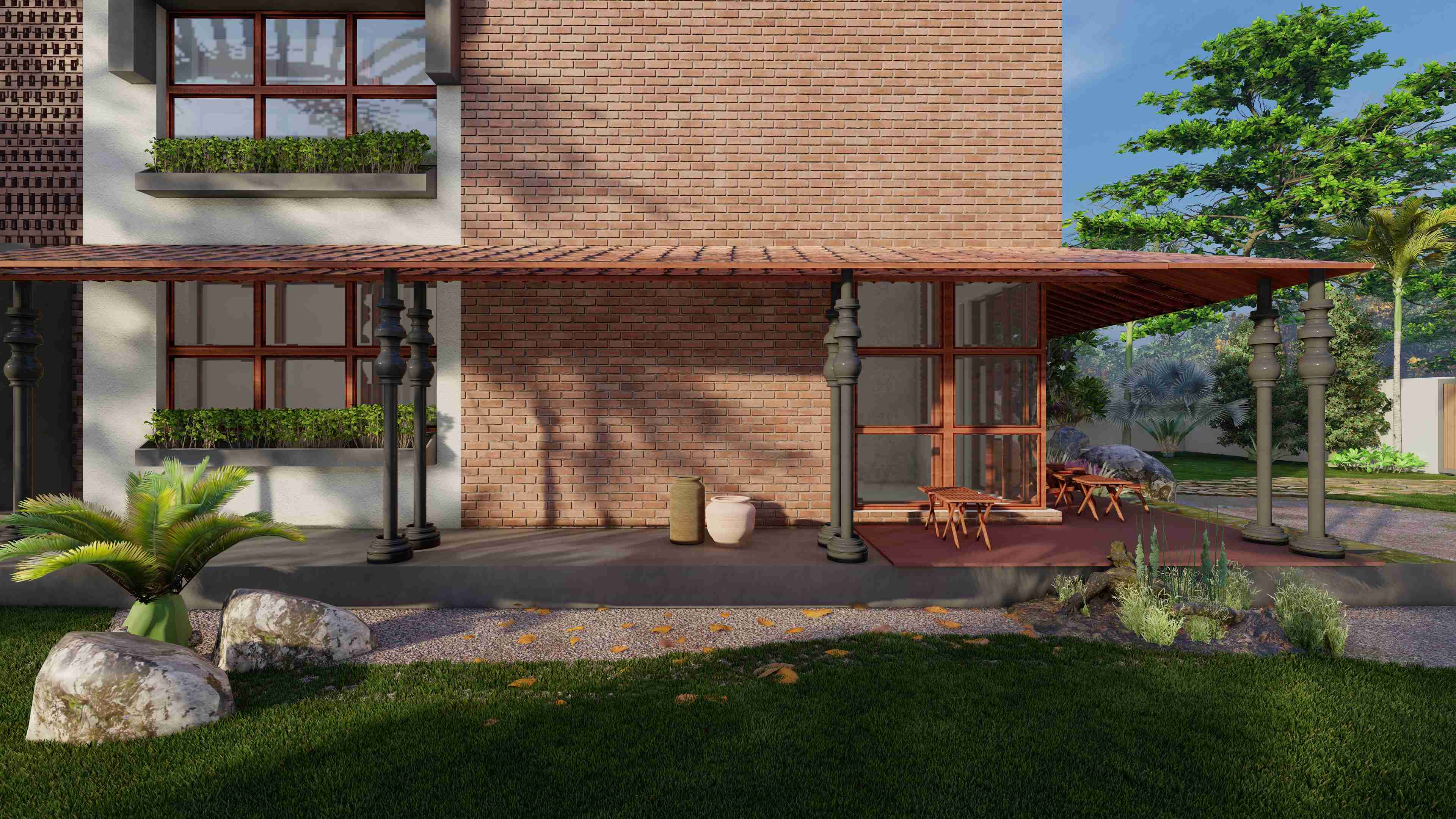 The concept of a traditional courtyard house form hustle and bustle of city life in Jamngar, Gujarat.This home is designed in traditional Kerala style.Crossing threshold, eye is drawn to the features of this residence, such as wooden columns, elaborately carved doors and windows which combines with a captivating composition that allows natural light to enter the house.The kyara guides the tulsi into the heart of the dwelling by passing through the “Nadumuttami”The courtyard is surrounded by living and dining areas and other areas that are the main grid. Use of old elements, sustainable construction techniques, traditional Kerala architecture and reuse of old doors and windows are the main highlights.The building is primarily composed of terracotta, texture, mud wall, expose concrete, rubble stone, mangalore tiles and structural elements.