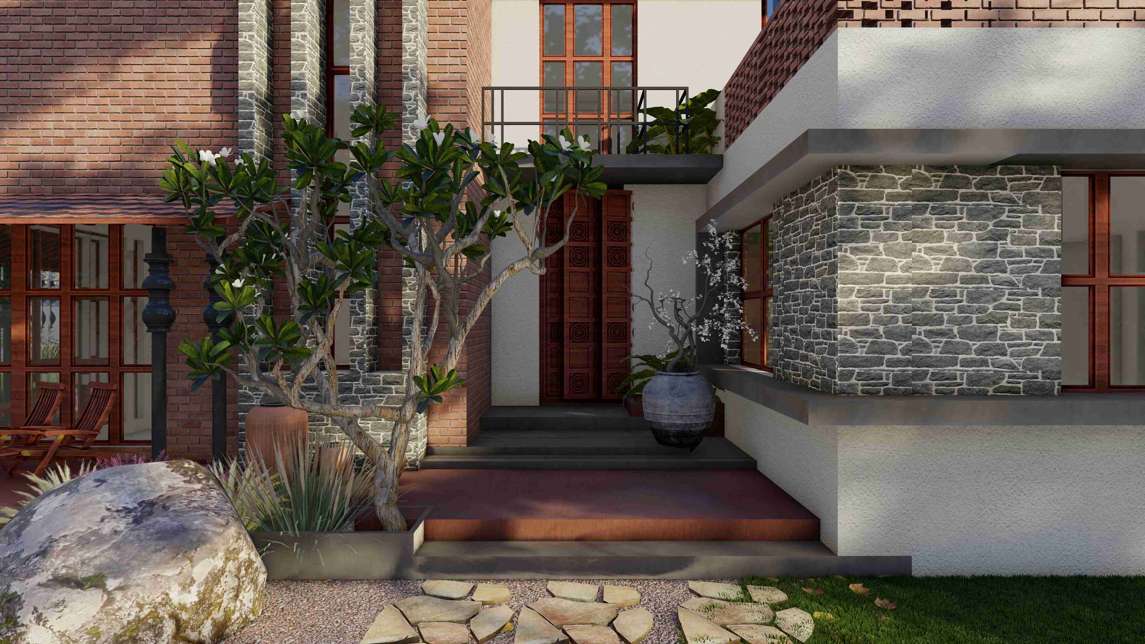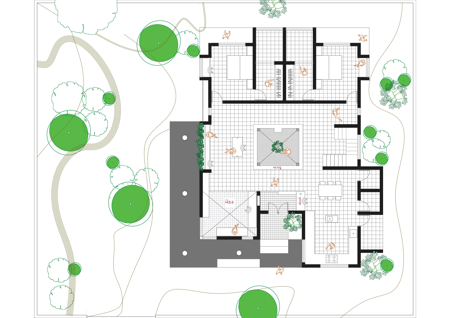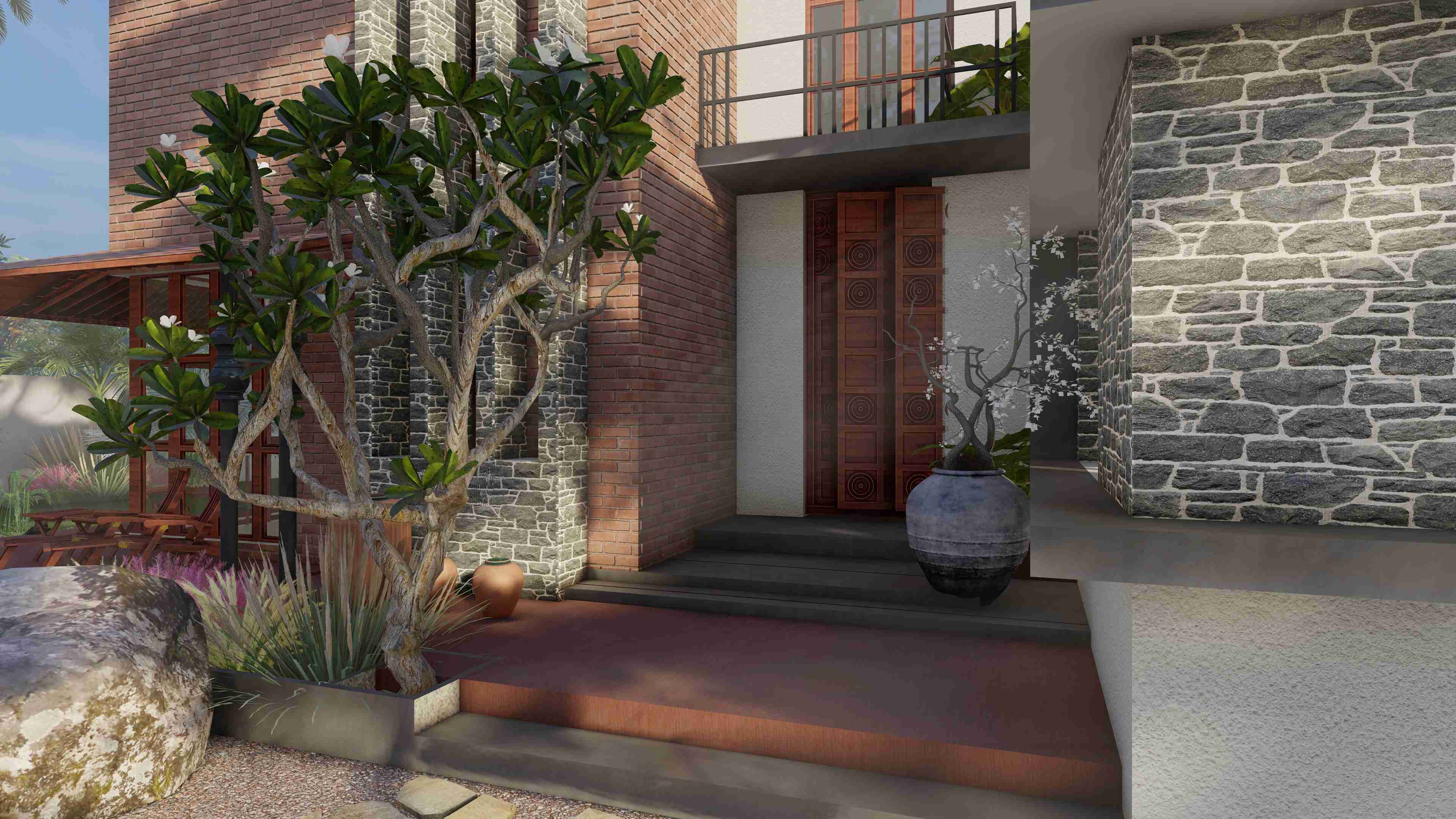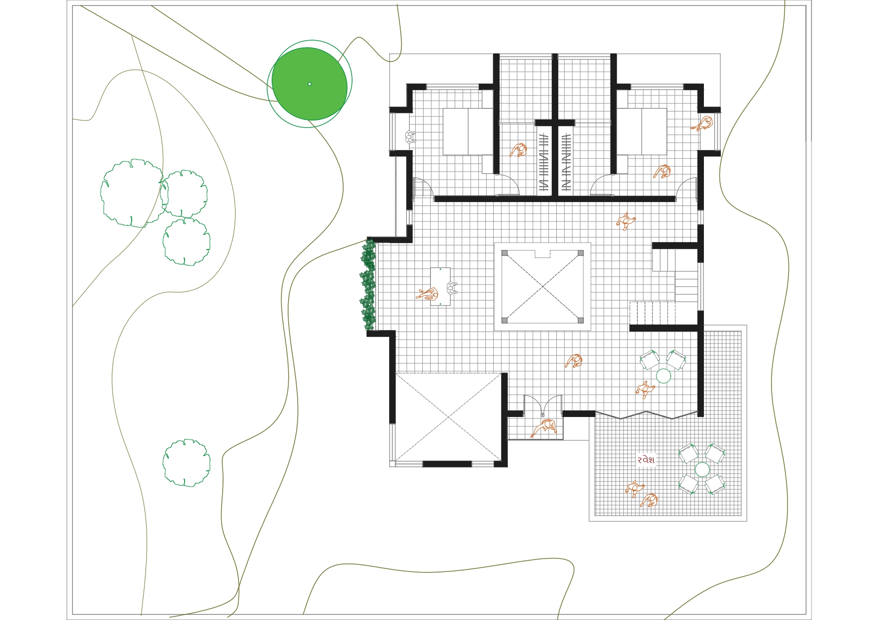 The concept of a traditional courtyard house form hustle and bustle of city life in Jamngar, Gujarat.This home is designed in traditional Kerala style.Crossing threshold, eye is drawn to the features of this residence, such as wooden columns, elaborately carved doors and windows which combines with a captivating composition that allows natural light to enter the house.The kyara guides the tulsi into the heart of the dwelling by passing through the “Nadumuttami”The courtyard is surrounded by living and dining areas and other areas that are the main grid. Use of old elements, sustainable construction techniques, traditional Kerala architecture and reuse of old doors and windows are the main highlights.The building is primarily composed of terracotta, texture, mud wall, expose concrete, rubble stone, mangalore tiles and structural elements.